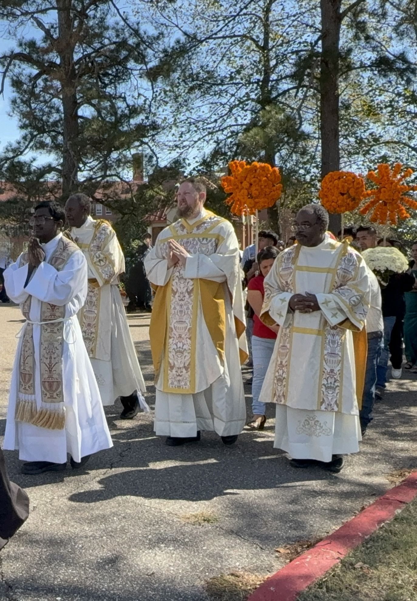 Fr. Jones, Fr. Raj, Dcn. Darrington, and Dcn. McMeans process with St. Jude and the parishioners to the Fiesta!